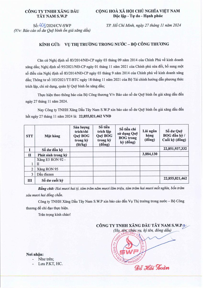 Công ty TNHH xăng dầu Tây Nam SWP xin báo cáo Quỹ bình ổn giá xăng dầu ngày 27/11/2024 là: 22,855,821,462 VNĐ