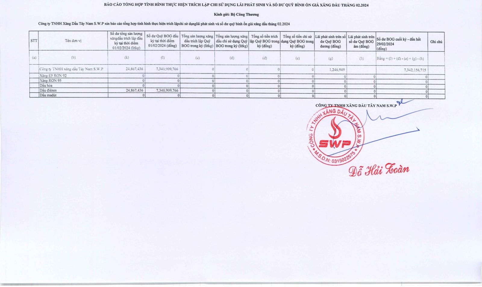 Công ty TNHH xăng dầu Tây Nam SWP xin báo cáo Quỹ bình ổn giá xăng dầu tháng 02 năm 2024 là: 7,342,156,715 VNĐ