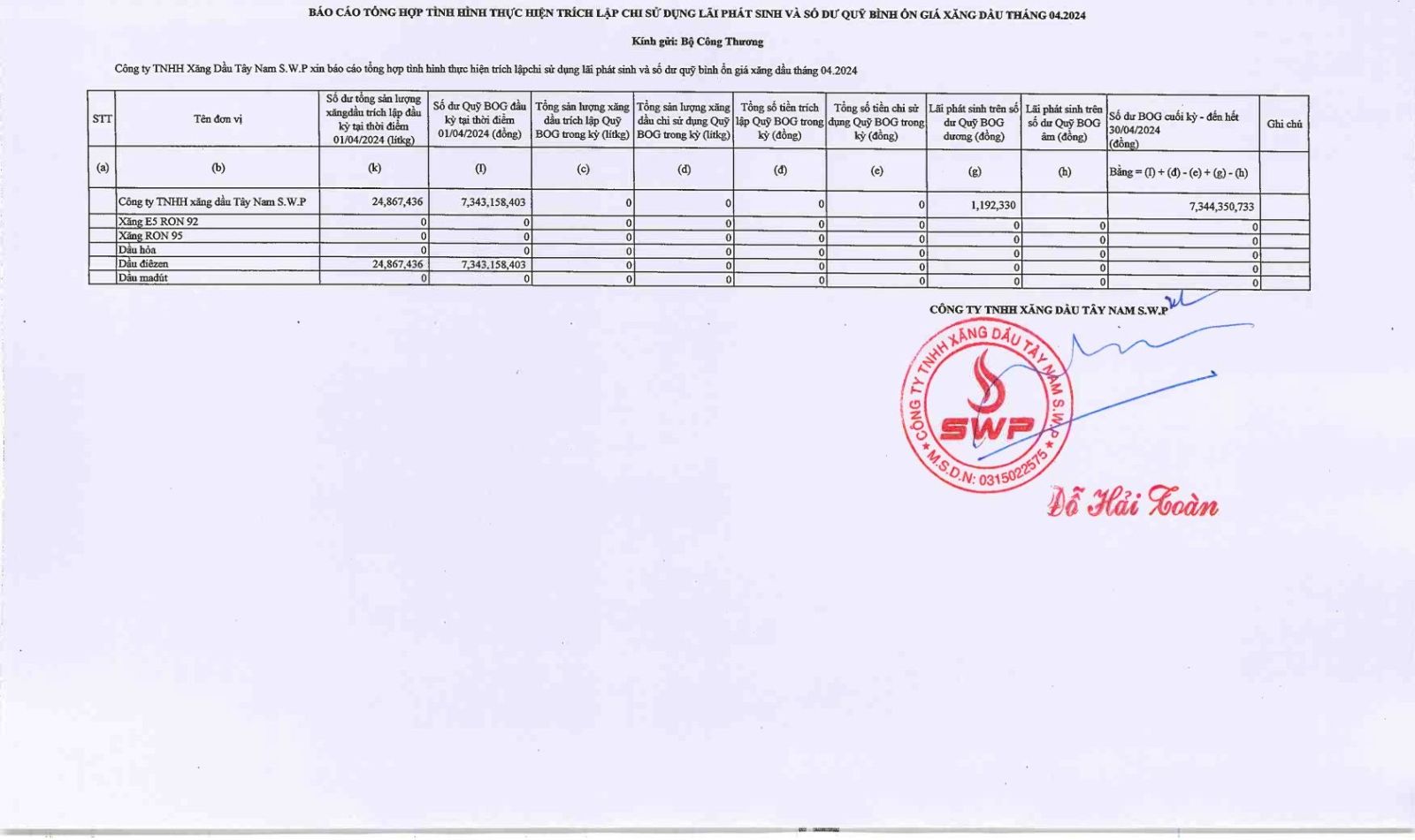 Công ty TNHH xăng dầu Tây Nam SWP xin báo cáo Quỹ bình ổn giá xăng dầu tháng 04 năm 2024 là: 7,334,350,733 VNĐ
