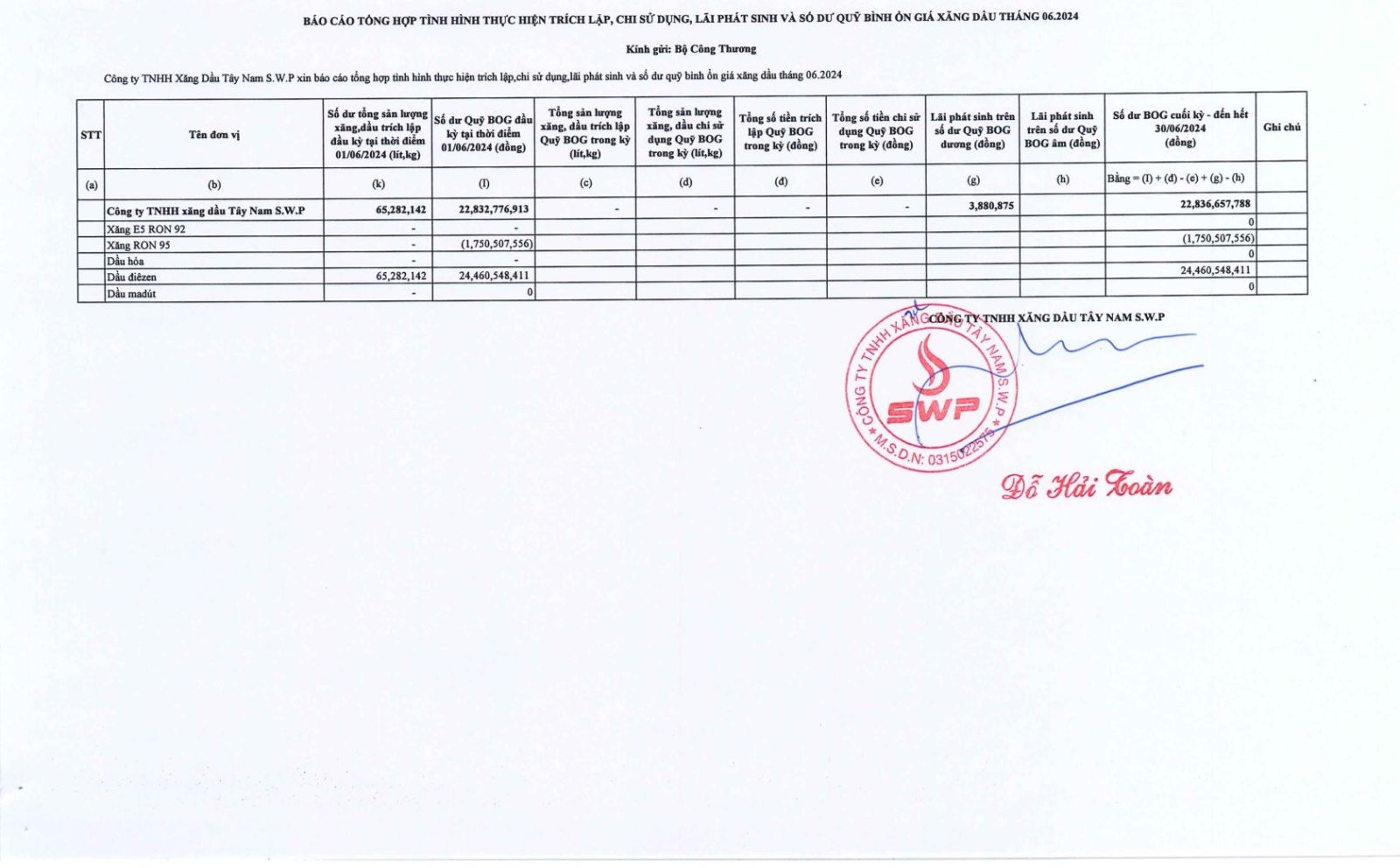 Công ty TNHH xăng dầu Tây Nam SWP xin báo cáo Quỹ bình ổn giá xăng dầu tháng 06 năm 2024 là: 22,836,657,788 VNĐ