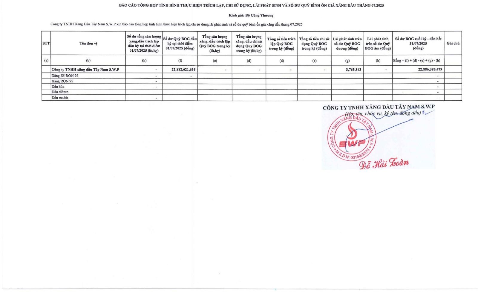 Công ty TNHH xăng dầu Tây Nam SWP xin báo cáo Quỹ bình ổn giá xăng dầu tháng 07 năm 2024 là: 22,886,385,479 VNĐ