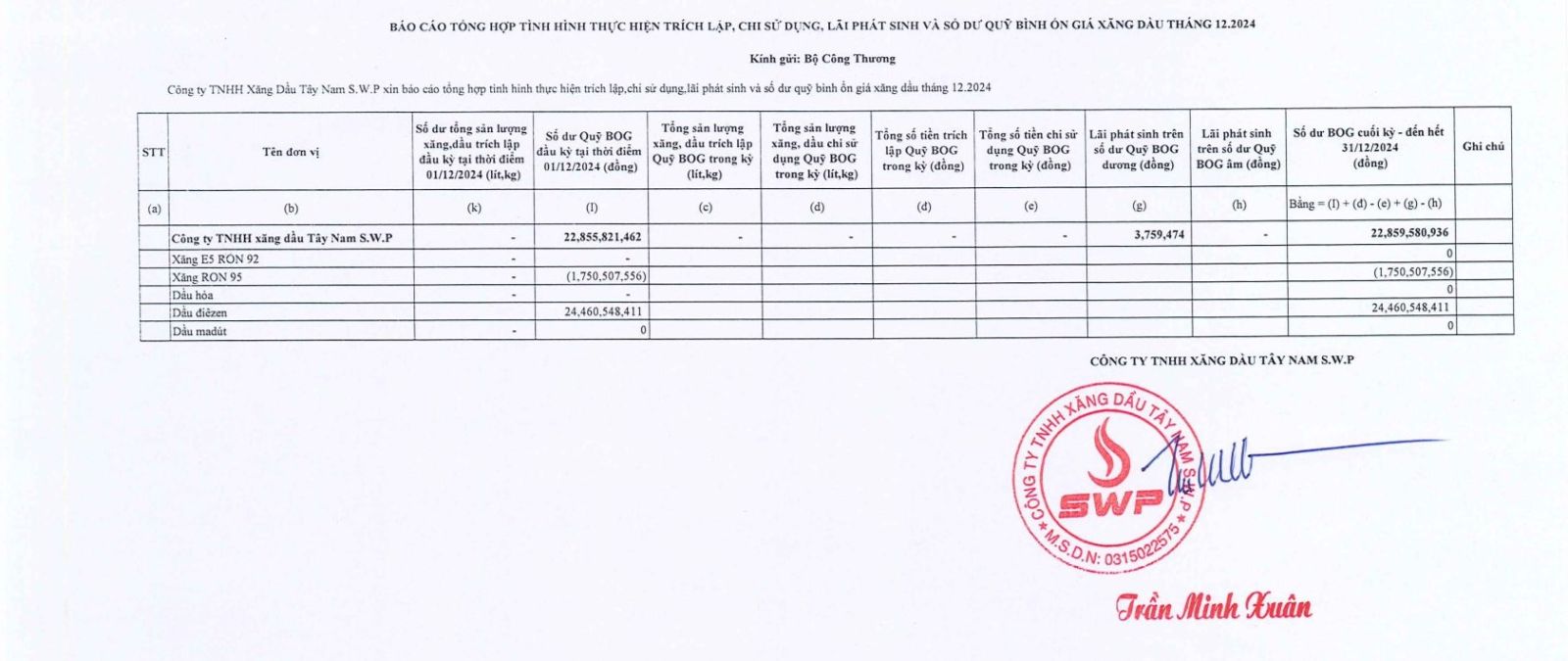 Công ty TNHH xăng dầu Tây Nam SWP xin báo cáo Quỹ bình ổn giá xăng dầu tháng 12 năm 2024 là: 22,859,580,936 VNĐ