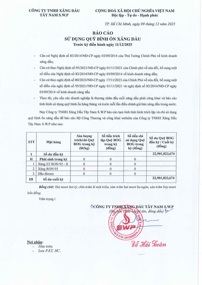 Công ty TNHH xăng dầu Tây Nam SWP xin báo cáo Quỹ bình ổn giá xăng dầu Tuần 03.12.2025 - 09.12.2025 là: 22,901,823,674 VNĐ