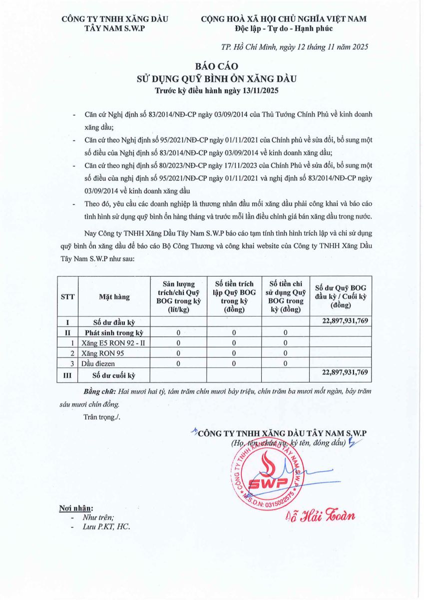 Công ty TNHH xăng dầu Tây Nam SWP xin báo cáo Quỹ bình ổn giá xăng dầu Tuần 06.11.2025 - 12.11.2025 là: 22,897,931,769 VNĐ