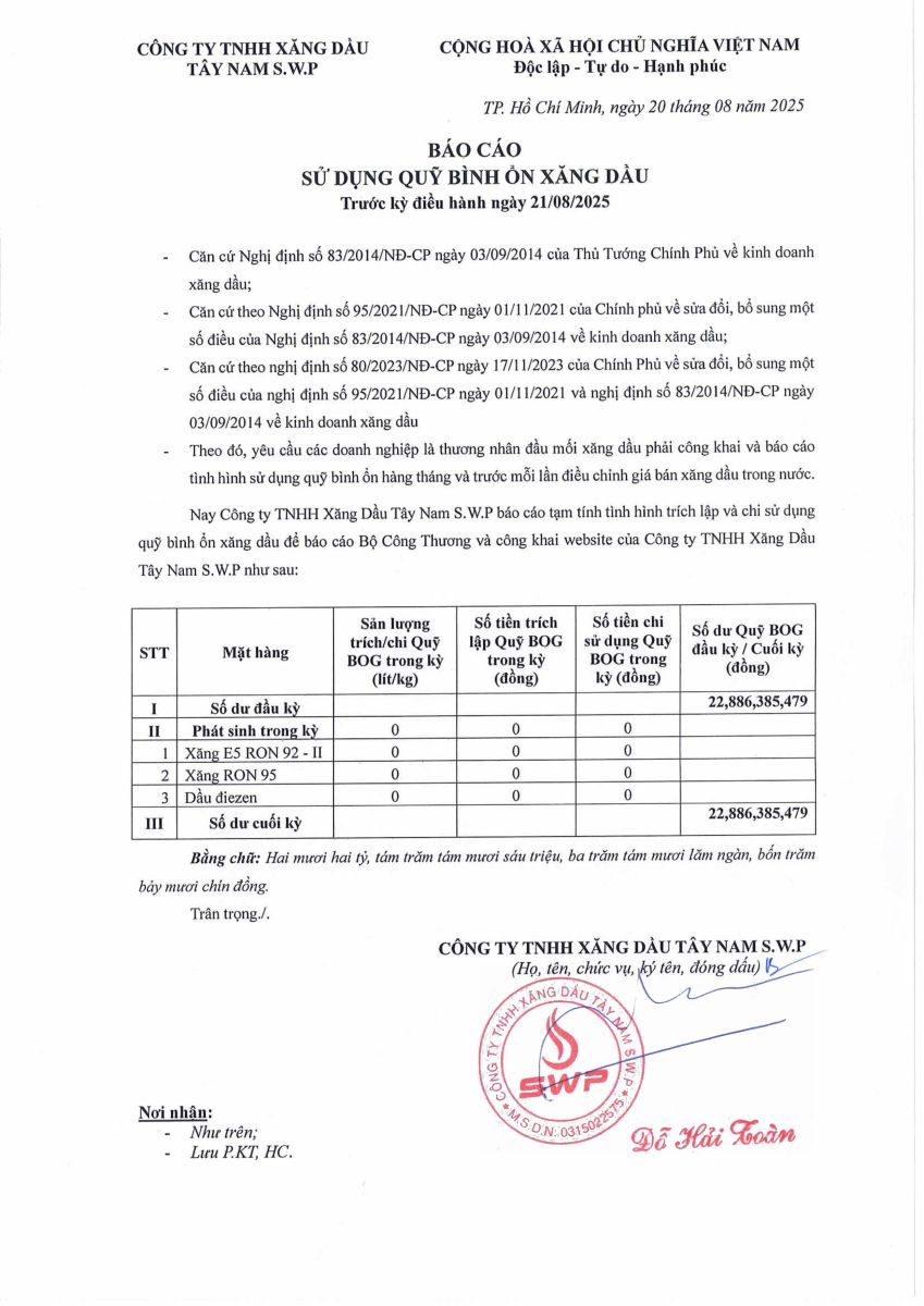Công ty TNHH xăng dầu Tây Nam SWP xin báo cáo Quỹ bình ổn giá xăng dầu Tuần 14.08.2025 - 20.08.2025 là: 22,886,385,479 VNĐ