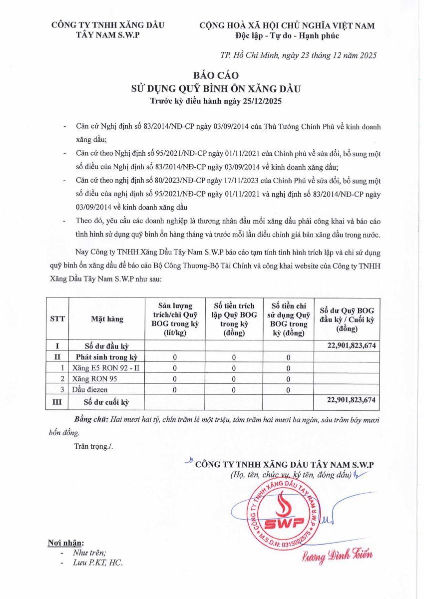 Công ty TNHH xăng dầu Tây Nam SWP xin báo cáo Quỹ bình ổn giá xăng dầu Tuần 17.12.2025 - 23.12.2025 là: 22,901,823,674 VNĐ