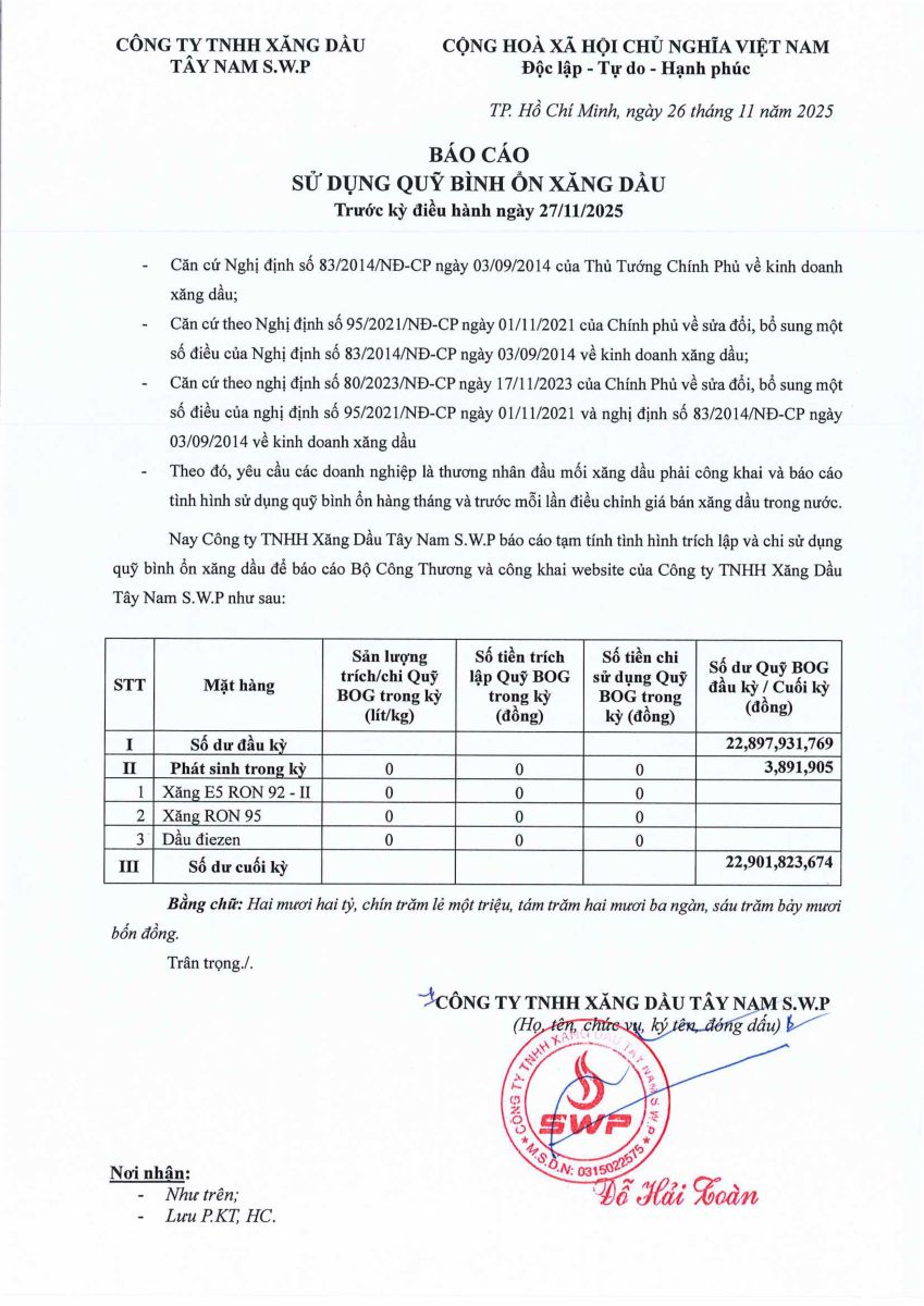 Công ty TNHH xăng dầu Tây Nam SWP xin báo cáo Quỹ bình ổn giá xăng dầu Tuần 20.11.2025 - 26.11.2025 là: 22,901,823,674 VNĐ