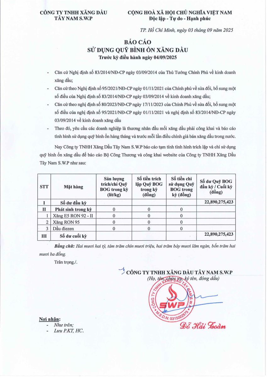 Công ty TNHH xăng dầu Tây Nam SWP xin báo cáo Quỹ bình ổn giá xăng dầu Tuần 28.08.2025 - 03.09.2025 là: 22,890,275,423 VNĐ