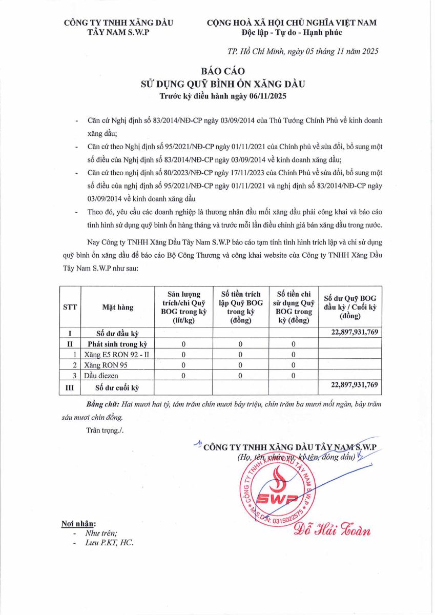 Công ty TNHH xăng dầu Tây Nam SWP xin báo cáo Quỹ bình ổn giá xăng dầu Tuần 30.10.2025 - 05.11.2025 là: 22,897,931,769 VNĐ
