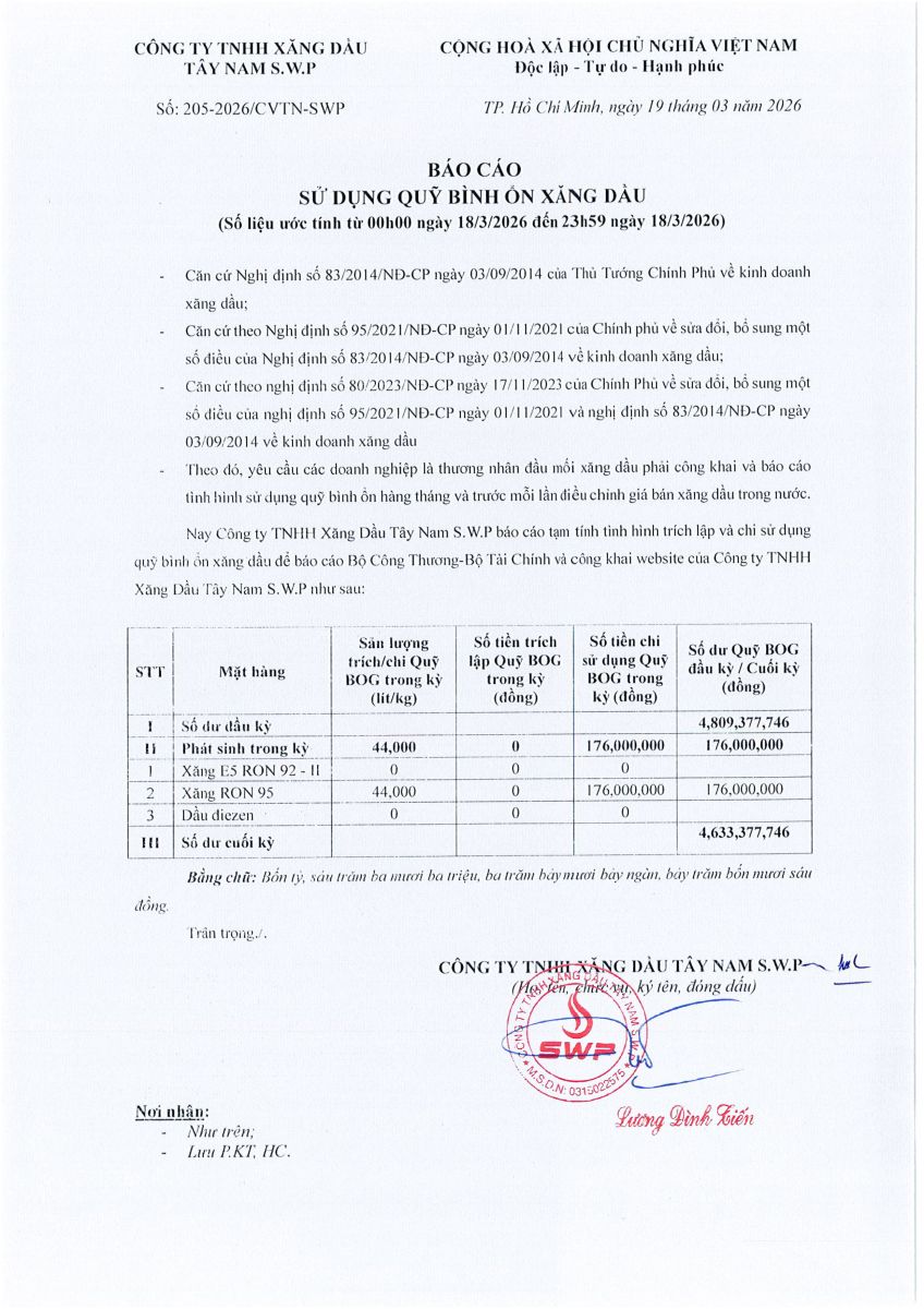 Công ty TNHH xăng dầu Tây Nam SWP xin báo cáo Quỹ Bình ổn Ước tính từ 00g00 ngày 18/03/2026 đến 24g00 ngày 18/03/2026 là: 4,633,377,746 VNĐ