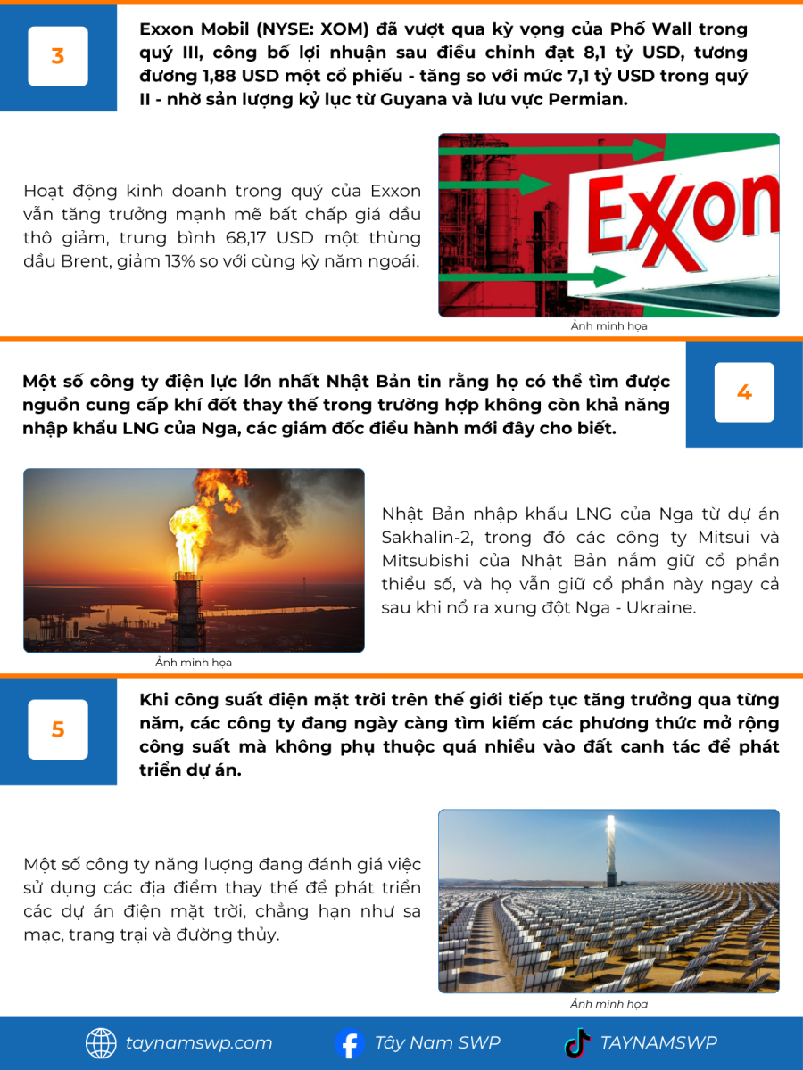 Giá dầu tăng nhẹ sau quyết định của OPEC+; Mỹ và Úc tăng cường chuỗi cung ứng đất hiếm; Exxon báo cáo lợi nhuận kỷ lục Q3; và các công ty Nhật tìm kiếm lựa chọn thay thế cho LNG Nga. Chi tiết trong bản tin!