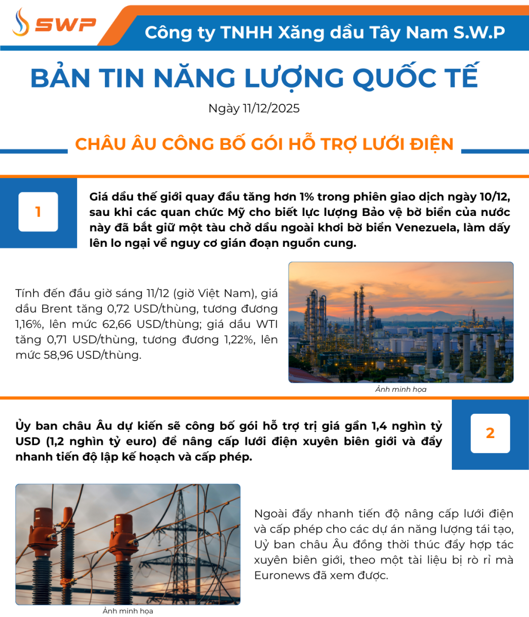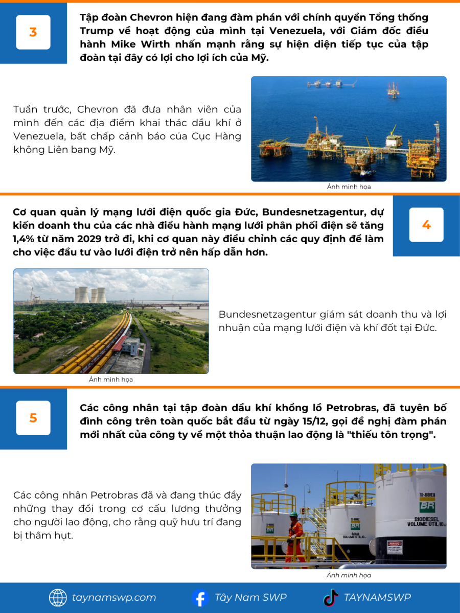 Giá dầu tăng nhẹ sau vụ Mỹ bắt giữ tàu chở dầu Venezuela; EU công bố gói hỗ trợ 1,4 nghìn tỷ USD cho lưới điện; Chevron thảo luận hoạt động Venezuela với chính quyền Mỹ; cơ quan Đức điều chỉnh quy định để khuyến khích đầu tư lưới điện; và công nhân Petrobras tuyên bố đình công trên toàn quốc. Chi tiết trong bản tin!