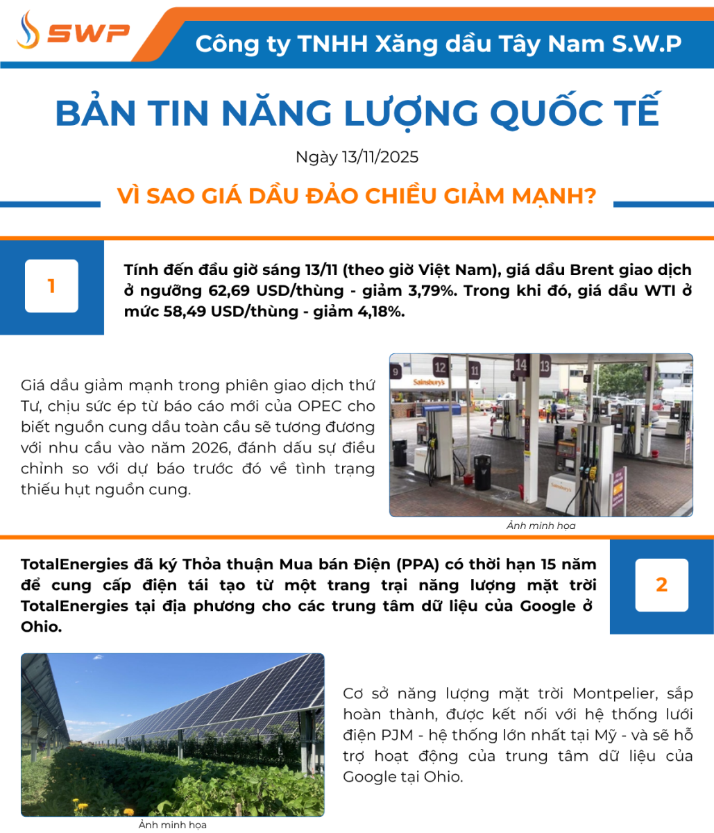 [Infograpic] Bản tin Năng lượng Quốc tế ngày 13/11/2025: Vì sao giá dầu đảo chiều giảm mạnh?
