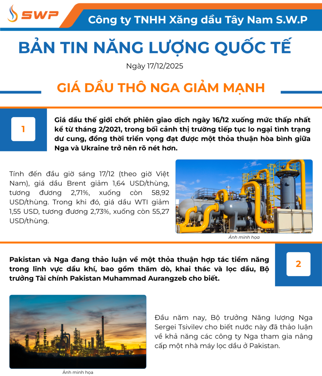 Tây Nam S.W.P xin gửi đến Quý độc giả những tin tức mới nhất trên thị trường Năng lượng Quốc tế.