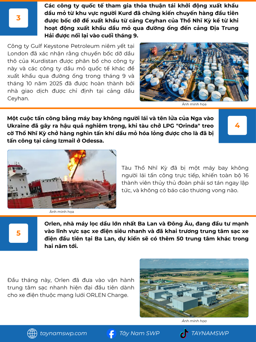 Thị trường năng lượng: Giá dầu giảm nhẹ; Kazakhstan kiện các công ty dầu khí lớn đòi bồi thường 166 tỷ USD; xuất khẩu dầu Kurdistan qua Ceyhan đã khởi động lại; một tàu LPG bị tấn công ở Odesa; và Orlen đầu tư mạnh vào trạm sạc xe điện siêu nhanh. Chi tiết trong bản tin!