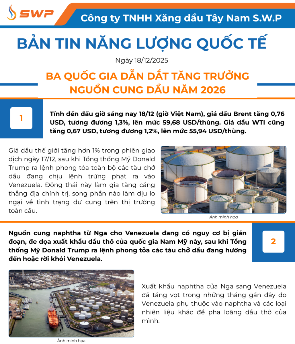 Tây Nam S.W.P xin gửi đến Quý độc giả những tin tức mới nhất trên thị trường Năng lượng Quốc tế.