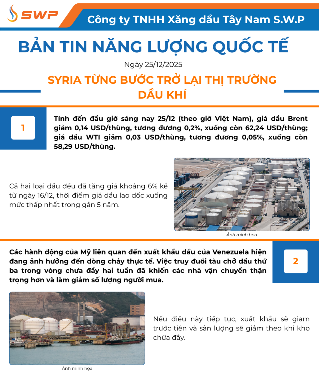 [Infograpic] Bản tin Năng lượng Quốc tế ngày 25/12: Syria từng bước trở lại thị trường dầu khí