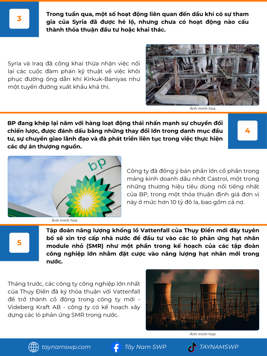 Giá dầu ổn định sau đà hồi phục; Syria và Iraq đàm phán nối lại đường ống dẫn khí; BP bán mảng Castrol trị giá 10 tỷ USD; và Thụy Điển đẩy mạnh đầu tư hạt nhân SMR. Chi tiết trong bản tin!