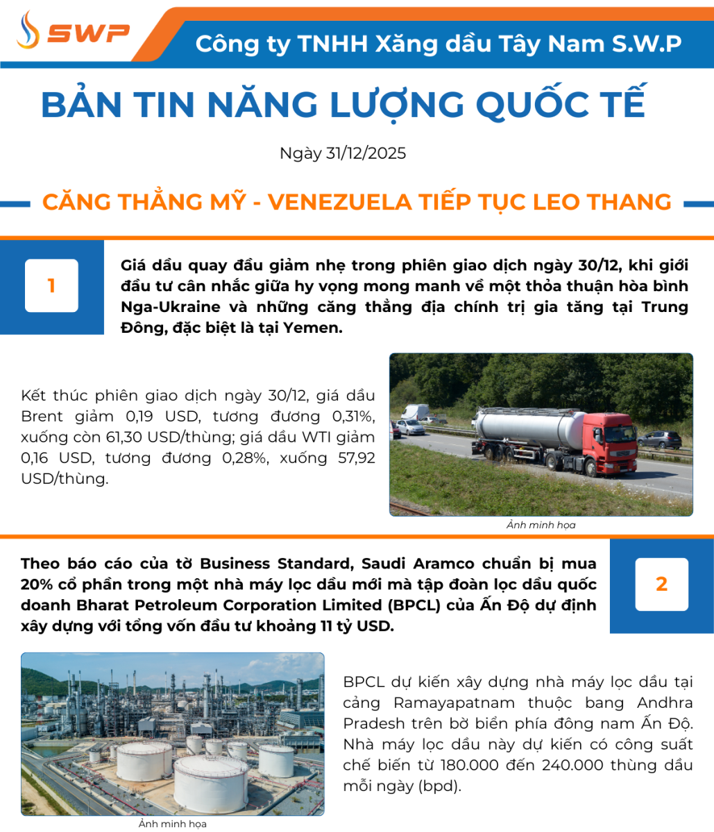 Tây Nam S.W.P xin gửi đến Quý độc giả những tin tức mới nhất trên thị trường Năng lượng Quốc tế.