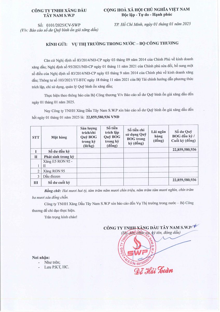 Công ty TNHH xăng dầu Tây Nam SWP xin báo cáo Quỹ bình ổn giá xăng dầu ngày 01/01/2025 là: 22,859,580,936 VNĐ