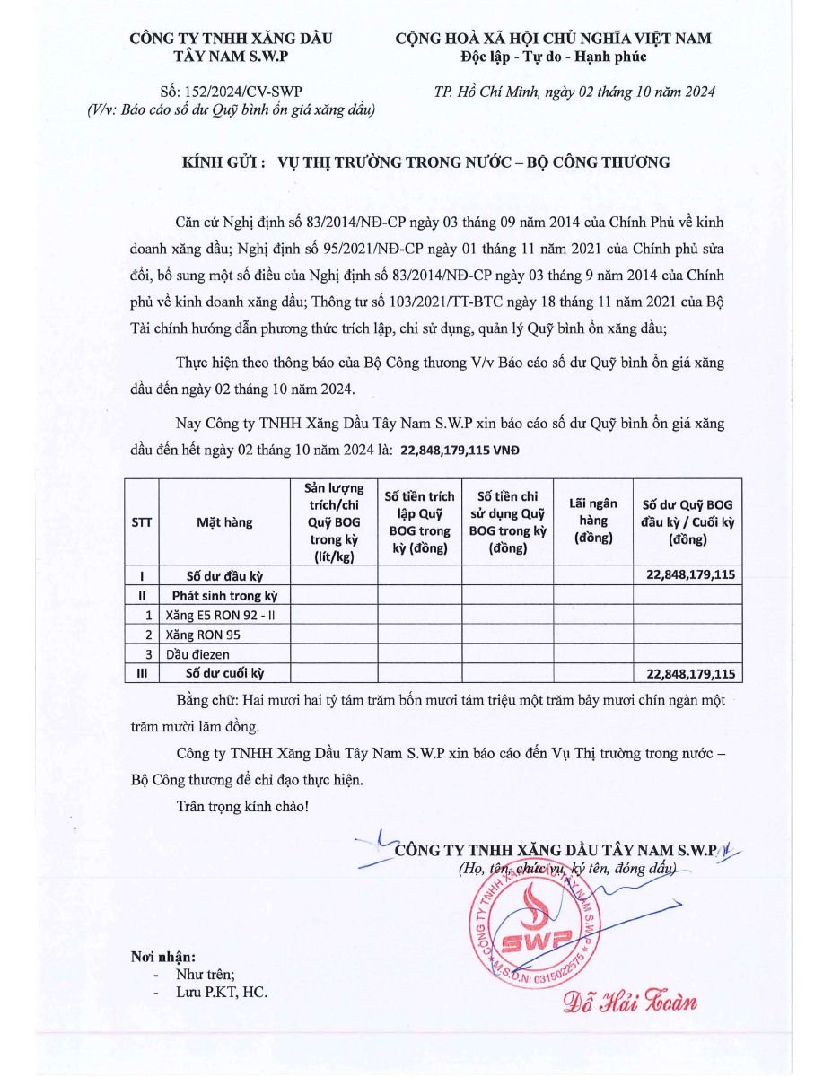 Công ty TNHH xăng dầu Tây Nam SWP xin báo cáo Quỹ bình ổn giá xăng dầu ngày 02/10/2024 là: 22,848,179,115 VNĐ