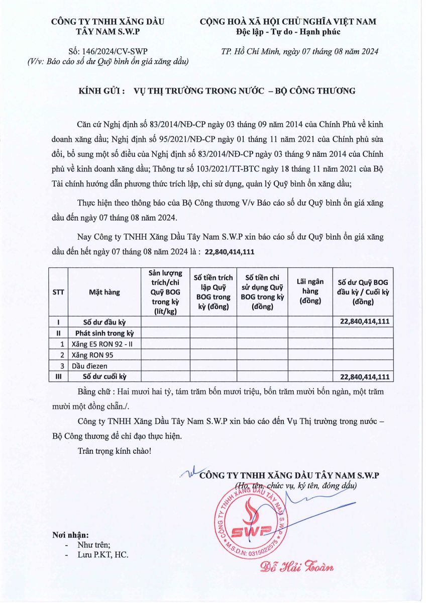 Công ty TNHH xăng dầu Tây Nam SWP xin báo cáo Quỹ bình ổn giá xăng dầu ngày 07/08/2024 là: 22,840,414,111 VNĐ