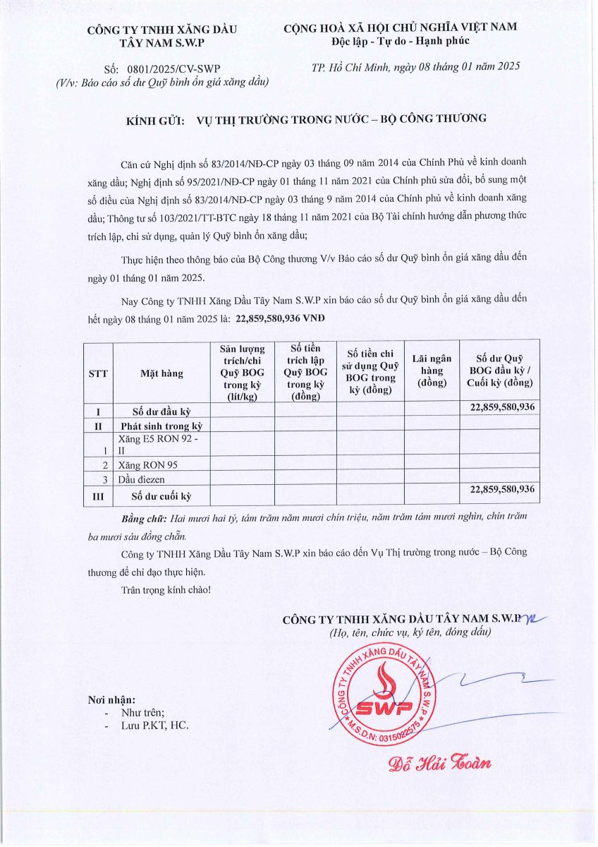 Công ty TNHH xăng dầu Tây Nam SWP xin báo cáo Quỹ bình ổn giá xăng dầu ngày 08/01/2025 là: 22,859,580,936 VNĐ