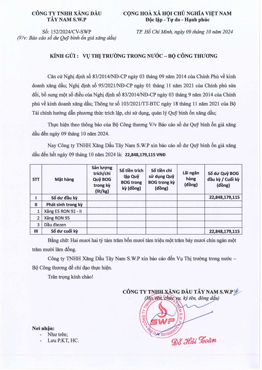 Công ty TNHH xăng dầu Tây Nam SWP xin báo cáo Quỹ bình ổn giá xăng dầu đến hết ngày 09/10/2024 là: 22,848,179,115 VND.