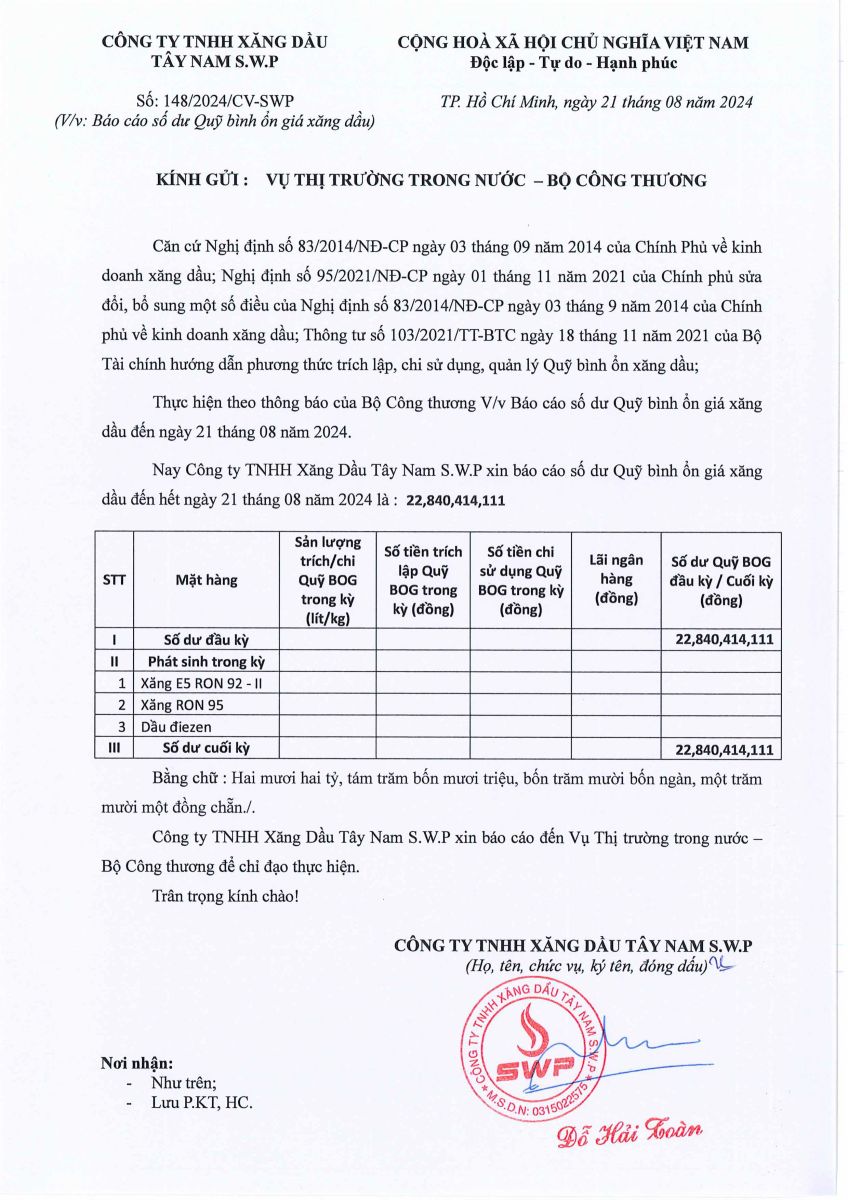 Công ty TNHH xăng dầu Tây Nam SWP xin báo cáo Quỹ bình ổn giá xăng dầu ngày 21/08/2024 là: 22,840,414,111 VNĐ