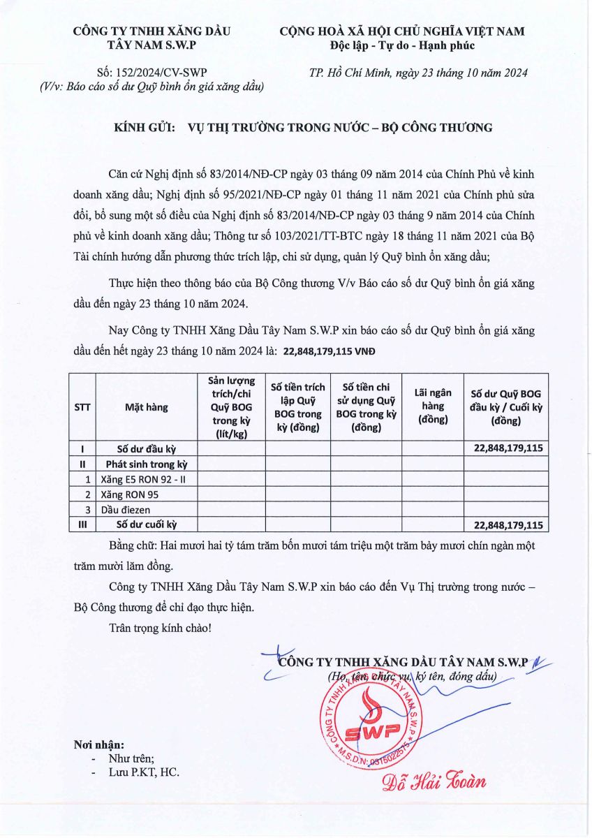 Công ty TNHH xăng dầu Tây Nam SWP xin báo cáo Quỹ bình ổn giá xăng dầu ngày 23/10/2024 là: 22,848,179,115 VNĐ