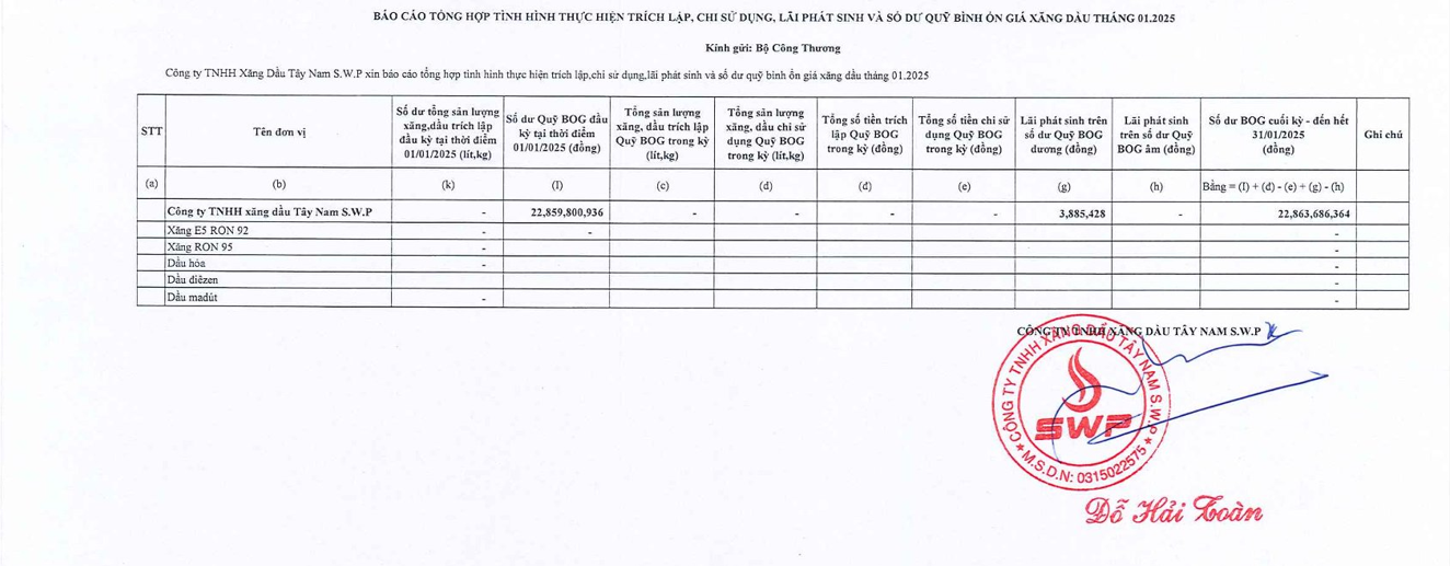 Công ty TNHH xăng dầu Tây Nam SWP xin báo cáo Quỹ bình ổn giá xăng dầu tháng 01 năm 2025 là: 22,863,686,364