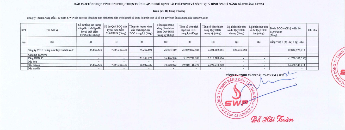 Công ty TNHH xăng dầu Tây Nam SWP xin báo cáo Quỹ bình ổn giá xăng dầu tháng 05 năm 2024 là: 22,832,776,913 VNĐ