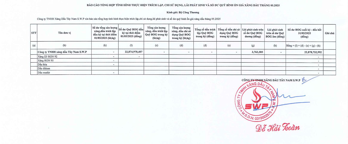 Công ty TNHH xăng dầu Tây Nam SWP xin báo cáo Quỹ bình ổn giá xăng dầu tháng 05 năm 2025 là: 22,878,732,992 VNĐ