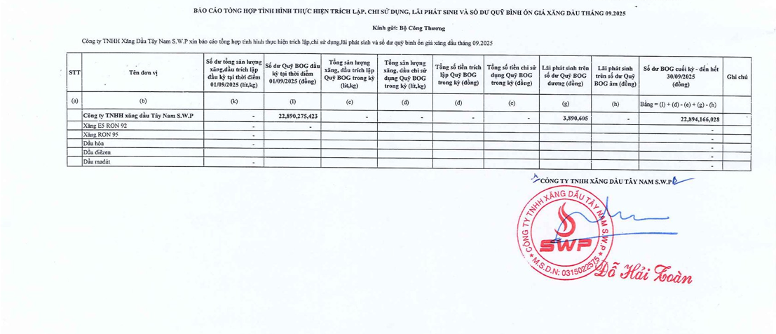 Công ty TNHH xăng dầu Tây Nam SWP xin báo cáo Quỹ bình ổn giá xăng dầu tháng 09 năm 2025 là: 22,894,166,028 VNĐ