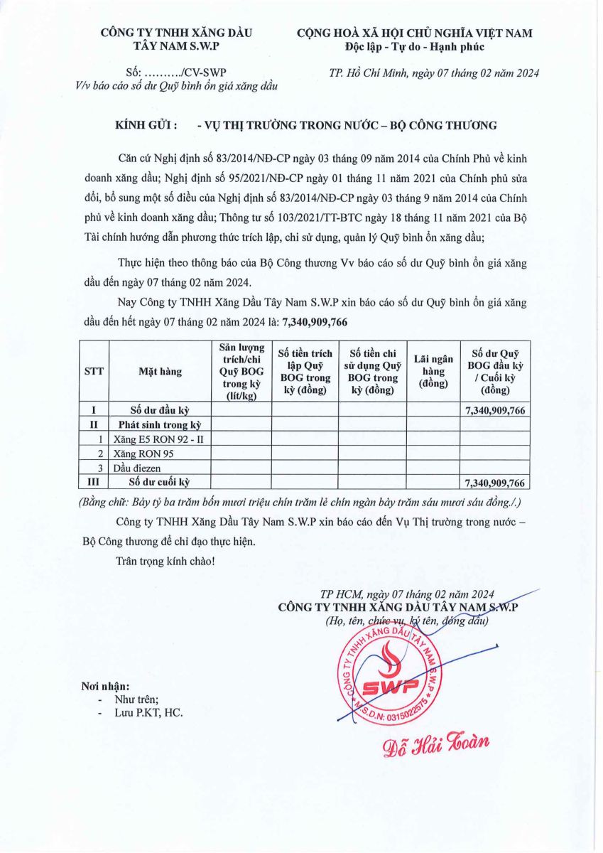 Công ty TNHH xăng dầu Tây Nam S.W.P xin báo cáo Quỹ bình ổn giá xăng dầu tuần 01/02/2024 - 07/02/2024 là: 7,340,909,766 VNĐ.