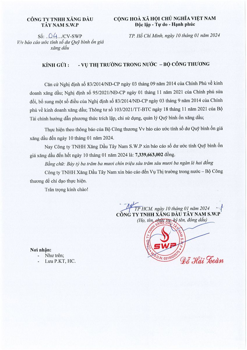 Công ty TNHH xăng dầu Tây Nam S.W.P xin báo cáo Quỹ bình ổn giá xăng dầu tuần 04/01/2024 - 10/01/2024 là: 7,339,663,002 VNĐ.