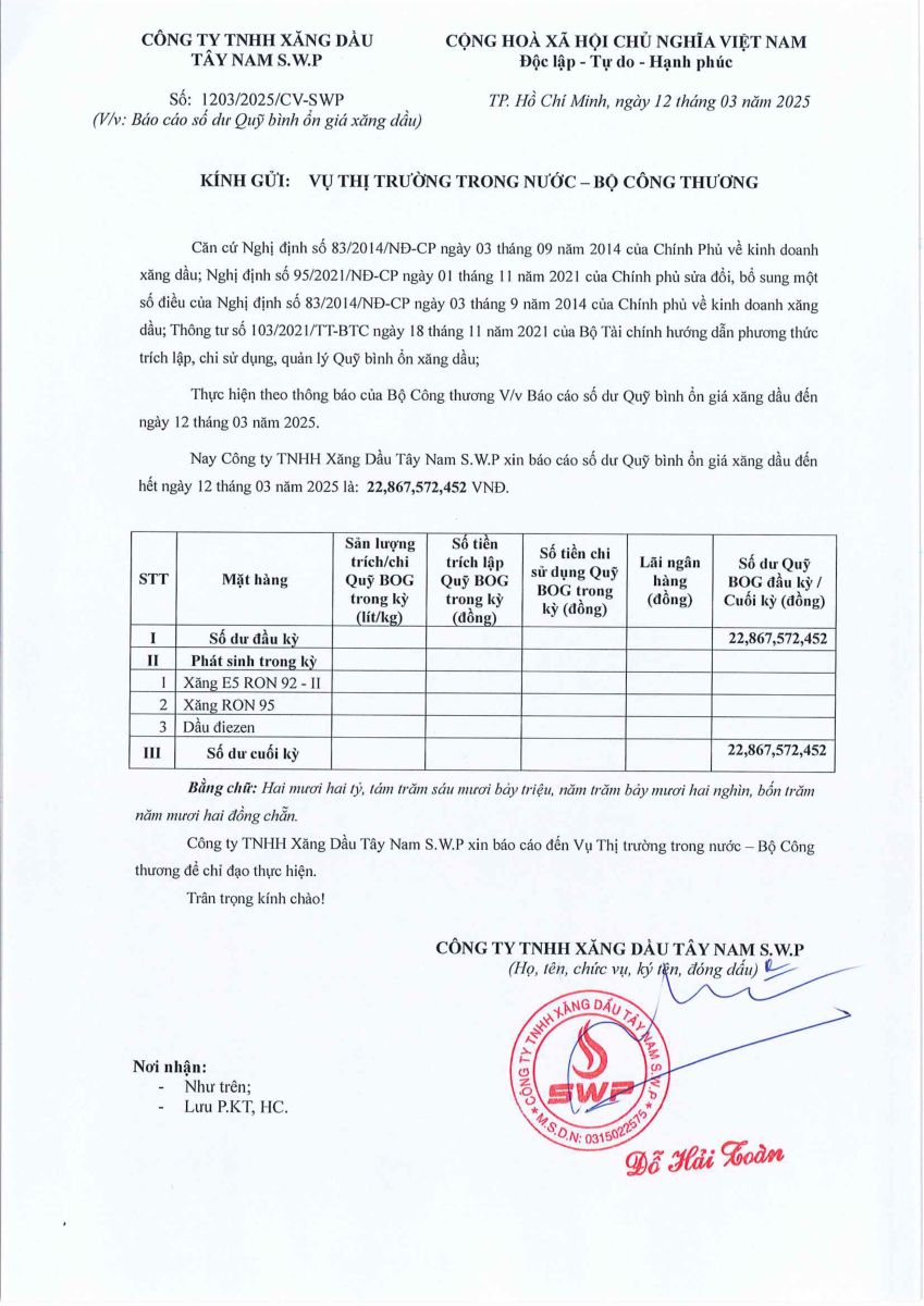 Công ty TNHH xăng dầu Tây Nam SWP xin báo cáo Quỹ bình ổn giá xăng dầu tuần 06.03.2025 - 12.03.2025: 22,867,572,452 VNĐ