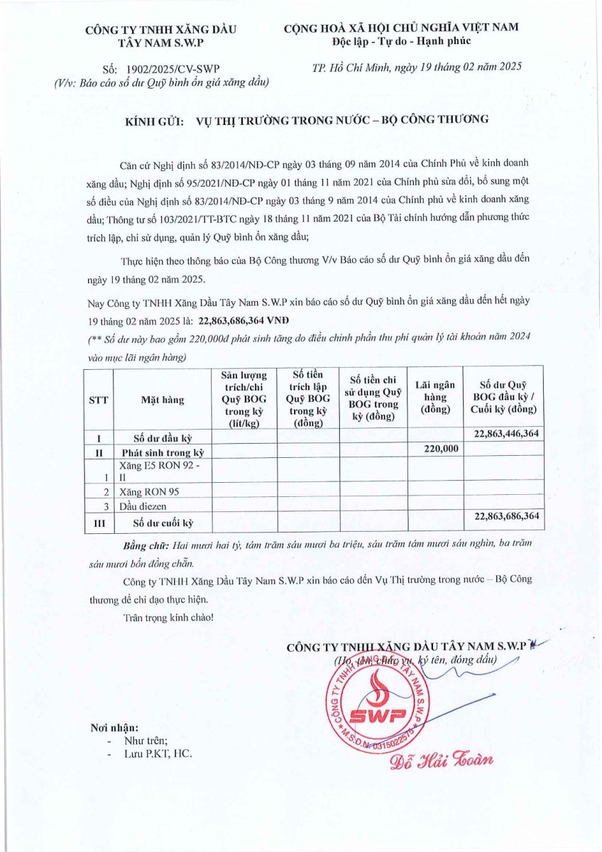 Công ty TNHH xăng dầu Tây Nam SWP xin báo cáo Quỹ bình ổn giá xăng dầu tuần 13.02.2025 - 19.02.2025 là: 22,863,686,364 VNĐ
