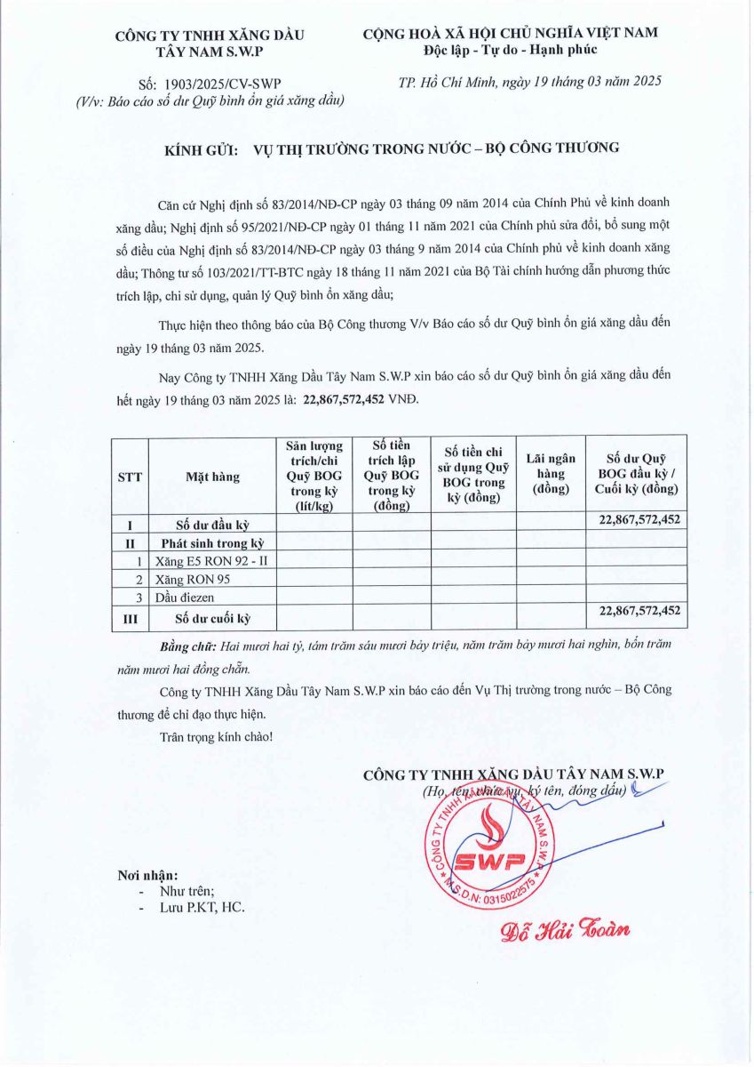 Công ty TNHH xăng dầu Tây Nam SWP xin báo cáo Quỹ bình ổn giá xăng dầu tuần 13.03.2025 - 19.03.2025 là: 22,867,572,452