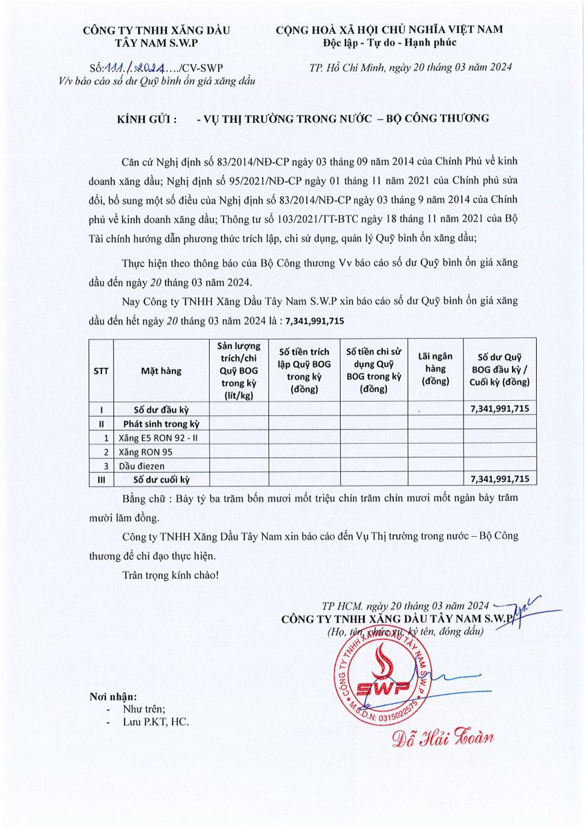 Công ty TNHH xăng dầu Tây Nam S.W.P xin báo cáo Quỹ bình ổn giá xăng dầu tuần 14/03/2024 - 20/03/2024 là: 7,341,991,715 VNĐ.