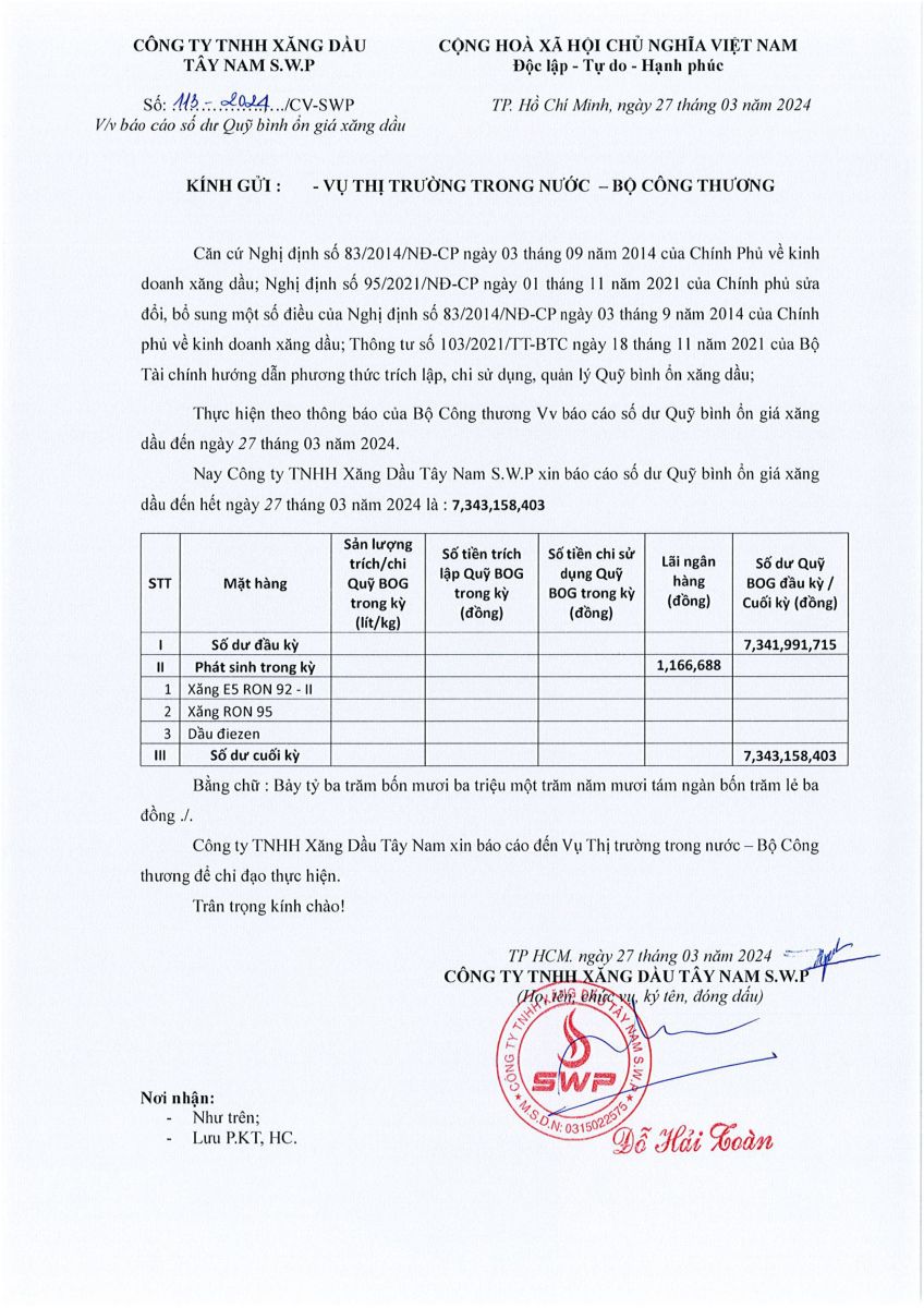 Công ty TNHH xăng dầu Tây Nam S.W.P xin báo cáo Quỹ bình ổn giá xăng dầu tuần 21/03/2024 - 27/03/2024 là: 7,343,158,403 VNĐ.