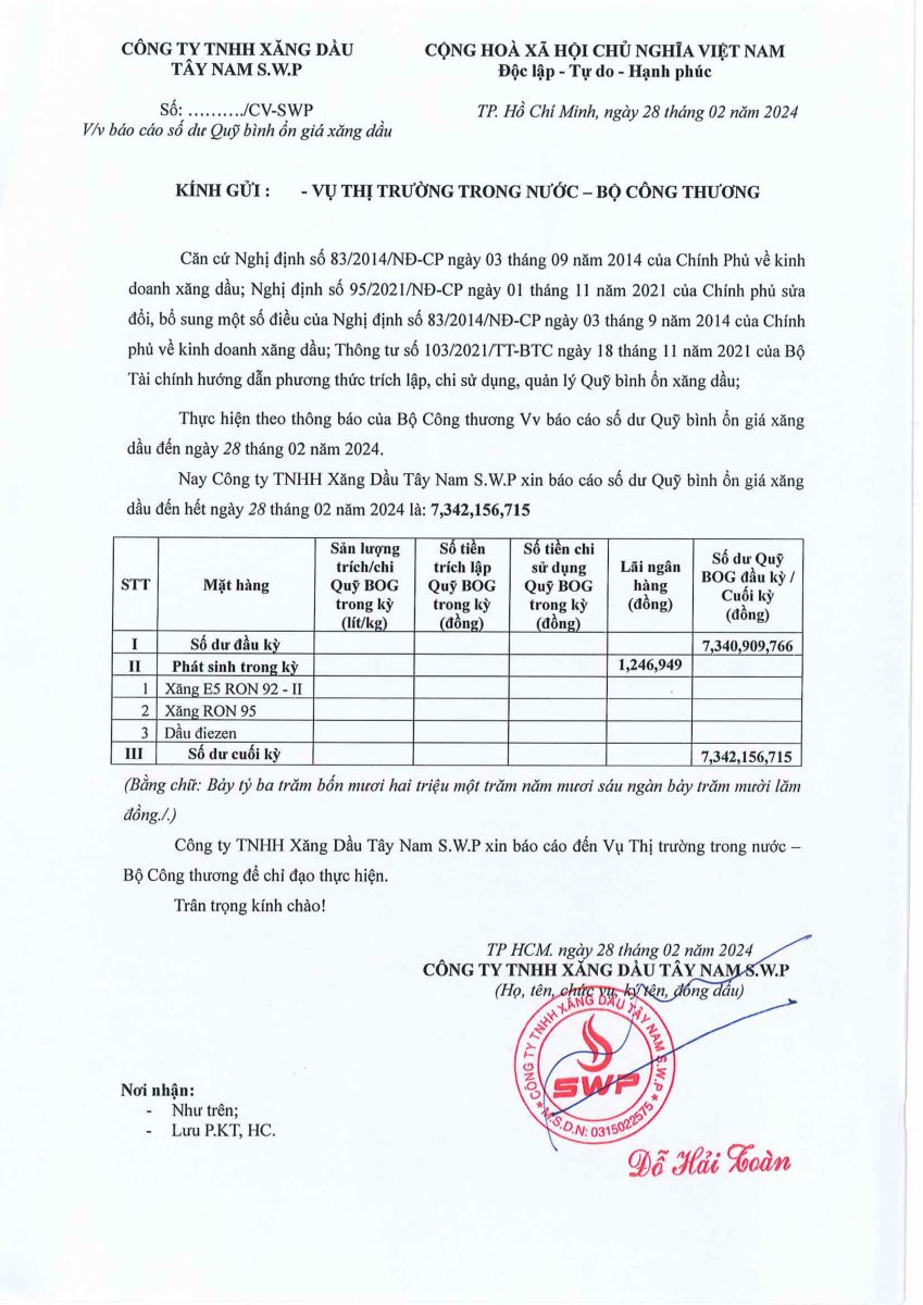 Công ty TNHH xăng dầu Tây Nam S.W.P xin báo cáo Quỹ bình ổn giá xăng dầu tuần 22/02/2024 - 28/02/2024 là: 7,342,156,715 VNĐ.