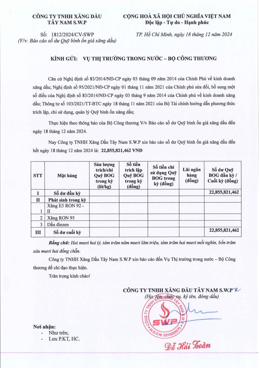 Công ty TNHH xăng dầu Tây Nam SWP xin báo cáo Quỹ bình ổn giá xăng dầu tuần này ngày 12/12/2024 đến 18/12/2024 là: 22,855,821,462.