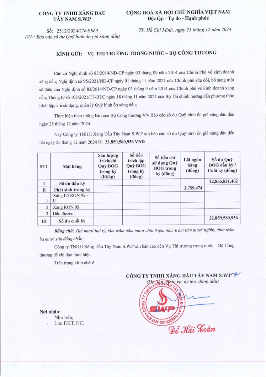 Công ty TNHH xăng dầu Tây Nam SWP xin báo cáo Quỹ bình ổn giá xăng dầu tuần này ngày 19/12/2024 đến 25/12/2024 là: 22,855,821,462.