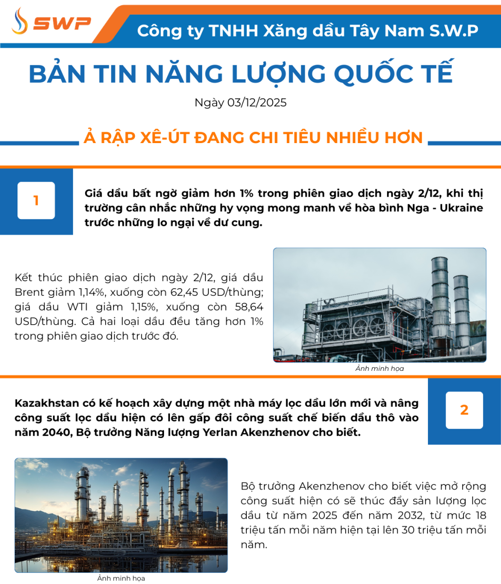 Giá dầu giảm mạnh sau khi Iraq khai thác trở lại tại West Qurna-2; TotalEnergies sáp nhập mảng thượng nguồn Anh với NEO NEXT; UAE tăng xuất khẩu LNG do nhu cầu tăng từ AI; nhu cầu nhiên liệu của Ấn Độ đạt đỉnh 6 tháng; và Kazakhstan chuyển hướng xuất khẩu dầu Kashagan sang Trung Quốc do sự cố đường ống CPC. Chi tiết trong bản tin!
