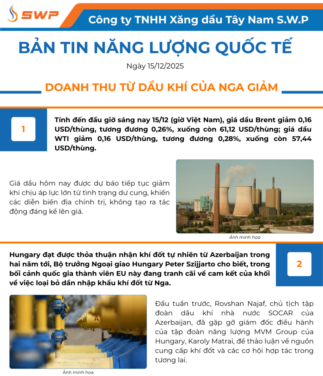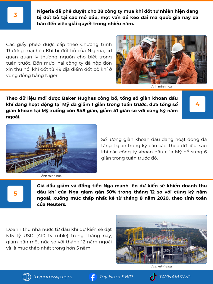 Giá dầu tiếp tục giảm do dư cung; Hungary đạt thỏa thuận khí đốt 2 năm với Azerbaijan; Nigeria cấp phép cho 28 công ty thu hồi khí đốt bị đốt bỏ; số giàn khoan Mỹ giảm nhẹ; và doanh thu dầu khí của Nga dự kiến giảm gần 50% trong tháng 12. Chi tiết trong bản tin!