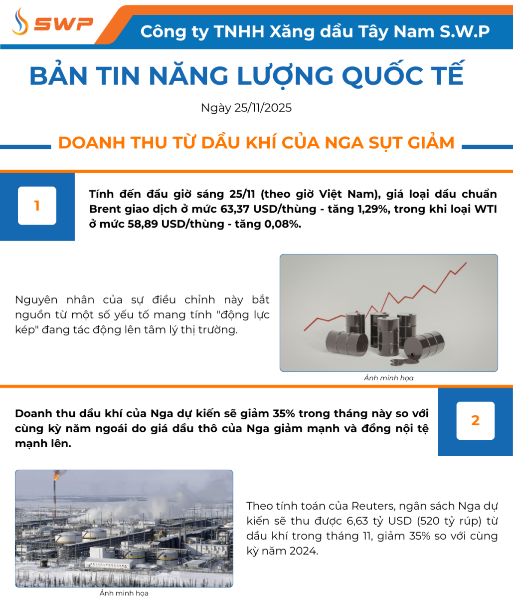 [Infograpic] Bản tin Năng lượng Quốc tế ngày 25/11: Doanh thu từ dầu khí của Nga sụt giảm